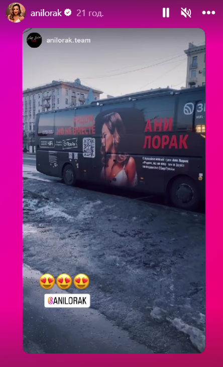На вулиці одного з російських міст з’явився великий чорний автобус, на якому зображена Ані Лорак. В тексті йде просування її нової пісні. Зрадниця навіть зробила репост відео шанувальників у своїх Instastories. Кароліна Куєк (справжнє ім'я співачки) майже рік від початку повномасштабної війни не виступала в росії. Але зараз в неї грандіозні плани на повернення.