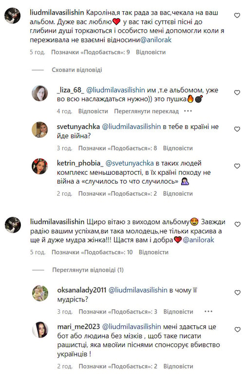 Також в коментарях деякі підписники Лорак висловили своє захоплення від нового альбому українською мовою. Це обурило українців, які не зрозуміли, як можна під час війни писати компліменти державною мовою співачці, яка називає терор Кремля "сталося, що сталося".