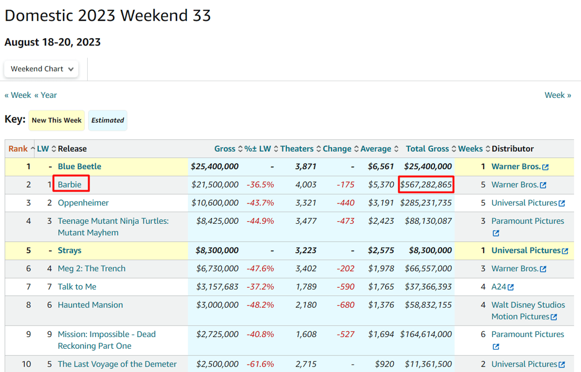 У свій п’ятий вікенд "Барбі" зібрала всього на 4 млн менше — 21 млн 500 тисяч доларів. Фільм про пластикову ляльку лише в американському прокаті зібрав 567 млн доларів. Зараз стрічка займає 15-ту сходинку в рейтингу найуспішніших фільмів в кінопрокаті США за весь час.