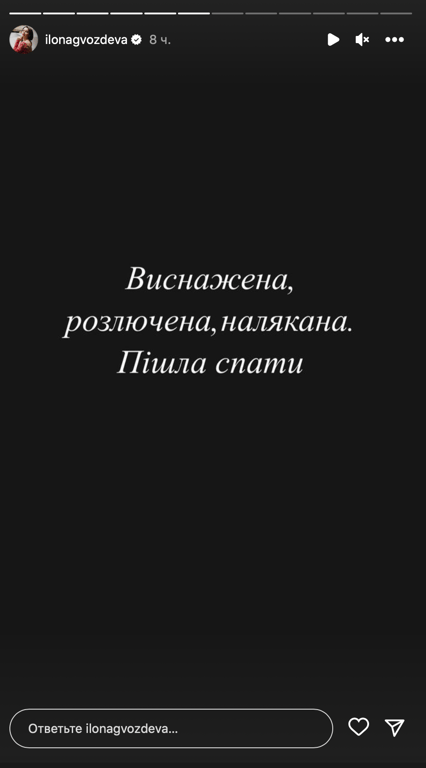 "Виснажена, розлючена, налякана. Пішла спати", — написала Ілона у сторіс.