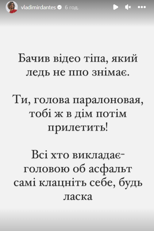 Шоумен зазначив, що не зміг заснути після гучної роботи ППО та о 4:30 ранку пішов варити макарони. Також Дантес присоромив українців, які знімають відео та викладають в соцмережі під час роботи військових.