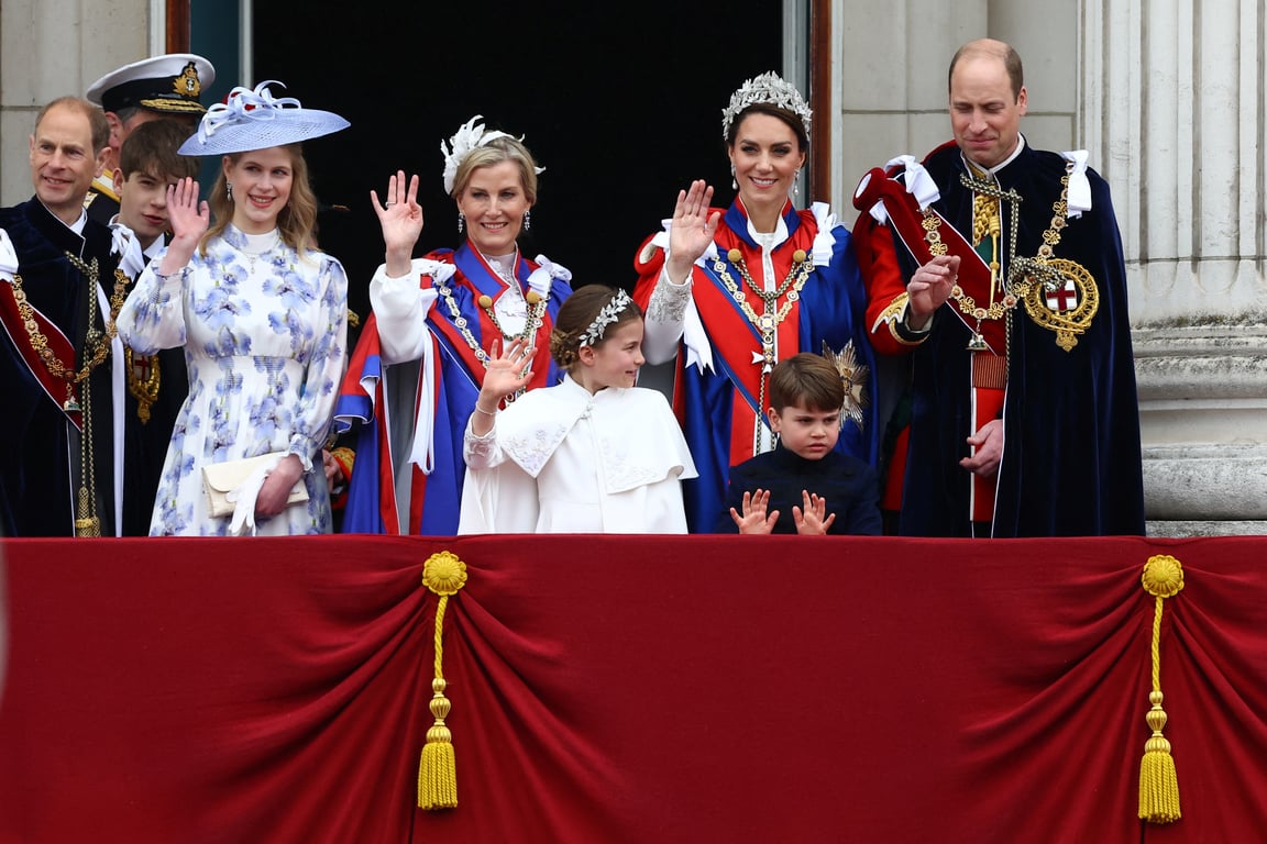 Окрім монарха Чарльза III та королеви Камілли, привітати народ з Букінгемського палацу на балкон вийшли 13 членів королівської родини. Серед них Вільям, принц Уельський; Кейт Міддлтон, принцеса Уельська; Джордж, принц Уельський; Шарлотта, принцеса Уельська; Луї, принц Уельський; Едвард, граф Уессекський; Софі, графиня Уессекська; принцеса Анна; віцеадмірал Тімоті Лоренс (чоловік принцеси Анни); Едвард, герцог Кентський; принцеса Александра, високоповажна леді Огілві; принц Річард, герцог Глостерський та Біргітта, герцогиня Глостерська.