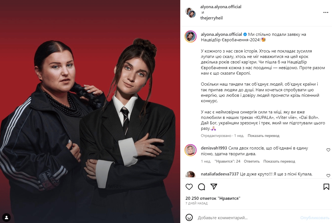 "Ми підемо на Нацвідбір, бо я щиро впевнена, що наш з Яною дует — це класний тандем, який несе світло, добро, гарну енергію, популяризацію українського контенту. Наші люди дуже скучили за нами за рік, всі просили. Ми так і не їздили в тур разом, в кожного своє життя, своя кар’єра. Хочеться сколихнути, можливо ця спроба буде вдвічі сильніша за першу", — зазначила Alyona Alyona.