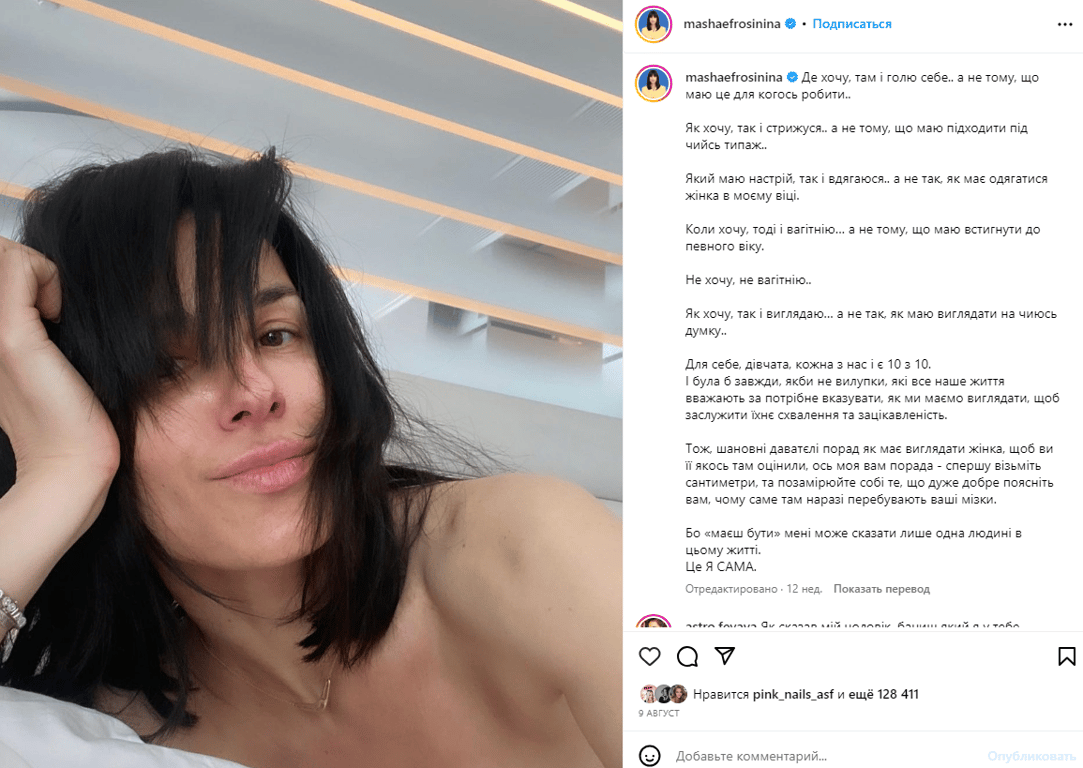 "Шановні радники, який вигляд має мати жінка, щоб ви її якось там оцінили, ось моя вам порада: спершу візьміть сантиметри та позамірюйте собі те, що дуже добре поясніть вам, чому саме там наразі перебувають ваші мізки. Бо "маєш бути" мені може сказати лише одна людина в цьому житті. Це я сама", — зазначила Маша Єфросиніна в Instagram.