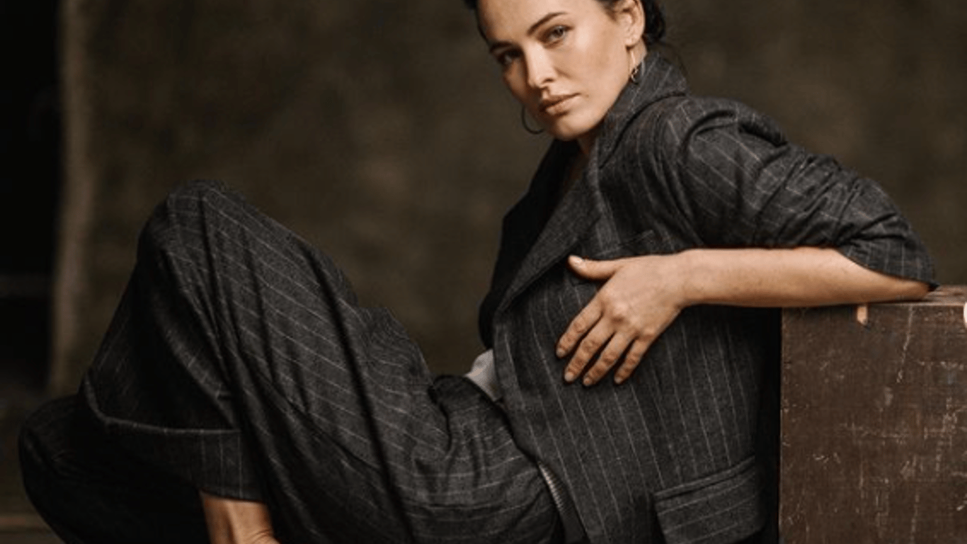 Свій допис Астаф’єва доповнила ефектним знімком. На ньому модель позує в темному брючному костюмі в тонку білу смужку. Піджак при цьому вдягнутий поверх на короткий топ.