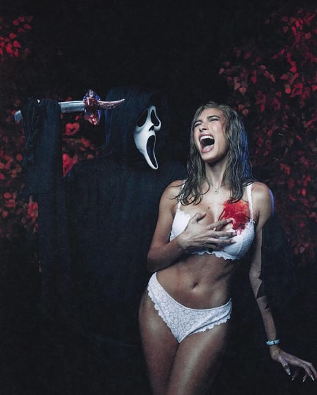 На одному з кадрів Гейлі відтворила сцену, в якій дзвонить у поліцію, на інших позує у білій спідній білизні. На останньому кадрі модель забруднена фальшивою кров'ю: за сюжетом, героїня фільму зазнала поранення, але її врятував силіконовий імплант.