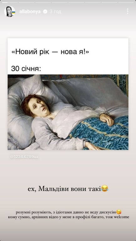 "А давайте допоможу найкращим незалежним ЗМІ. І покажу ще архівів, а то якось мало фото під ваші дешеві статті. Я вже і сама не розумію, куди мене телепортували. Так зганьбити журналістику у такий час — це треба мати талант. Хотіла багато чого сказати, але ворог слідкує і сміється з вас", — зазначила Алла.