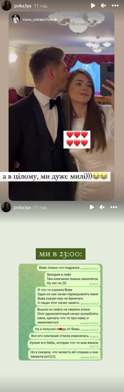 За словами третьої дружини Остапчука, неприємна ситуація трапилась з ними о 23:00 вечора. Локацію молода блогерка не стала розкривати. Але оприлюднила фрагмент листування російською мовою в одному з месенджерів. Зіркова парочка увійшла в ліфт, в якому була компанія молодих людей до 25 років. Полтавська стверджує, що хлопці та дівчата були напідпитку.