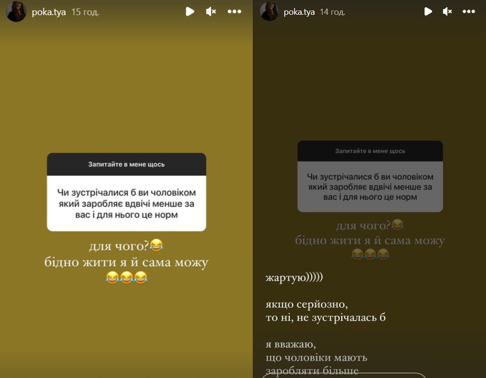 Трохи згодом інший підписник Катерини поставив чітке запитання щодо Володимира Остапчука: "Ти не відповідаєш. Вова тебе повністю утримує? Ти не працюєш, для тебе це норм?". Мовчати Полтавська не стала та дала розгорнуту відповідь. Запитання від підписника Катерина назвала "наїздом".