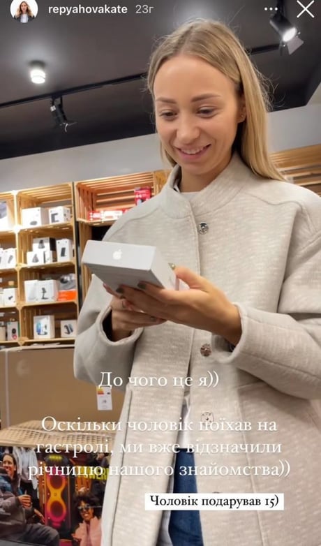 "Я взагалі спокійна до нових айфонів і в житті б не купила собі 15 зараз, якби не Віктор Павлік. У мене були 13 і 12. Чесно сказати, 12 я люблю набагато більше", — розповіла Репяхова у сторіс.