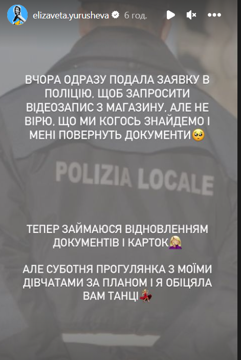 "Вчора я вперше мала справу з італійською поліцією. У мене вкрали паспорт, усі картки, водійські права та трохи грошей. Це все було в обкладинці паспорта, яку власне витягли. Де? В магазині", — зізналась Юрушева.