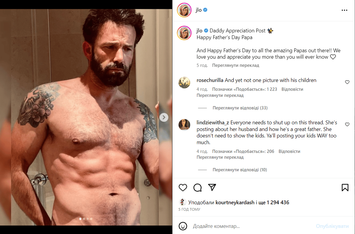 Співачка опублікувала фотографії з нагоди Дня батька, який цього року святкували 18 червня. Користувачі соцмереж не зрозуміли, чому Джей Ло показала Бена Аффлека без дітей. Зазначимо, що зірки були в шлюбах та мають дітей від інших партнерів. Спільних нащадків у Джей Ло та Бена немає.