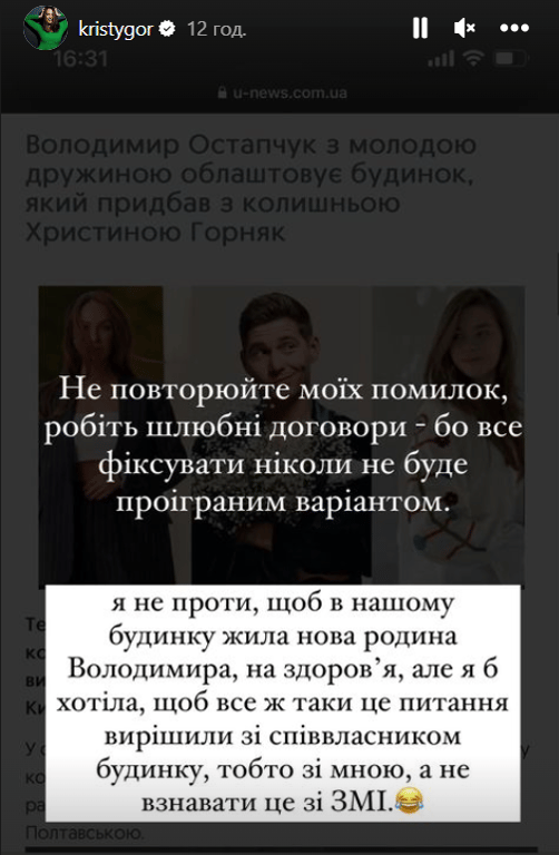 "Будинок, який ми будували в шлюбі, та досі не вирішили питання по ньому, вже перебудовують і планують в ньому жити. Ну ок, будемо жити всі разом, адже майно набуте нами в законному шлюбі є нашим спільним майном колишнього подружжя, 50 на 50", — зазначила Горняк.