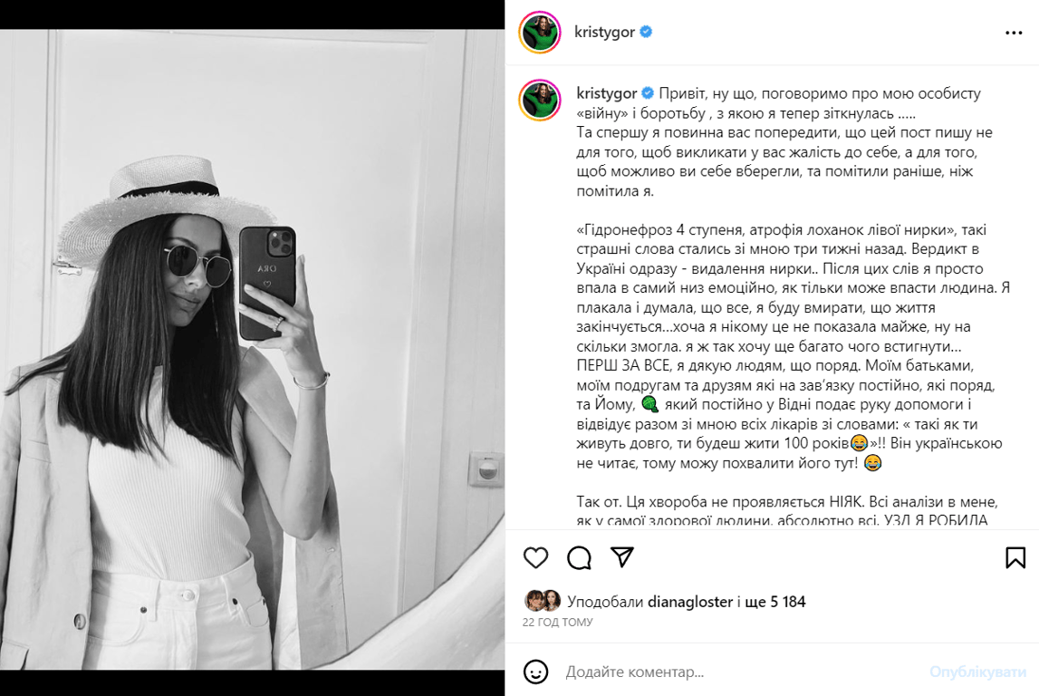 Напередодні, ексдружина шоумена Володимира Остапчука, юристка Христина Горняк, зізналась, що в неї проблеми з нирками. 36-річна зірка вперше назвала діагноз.