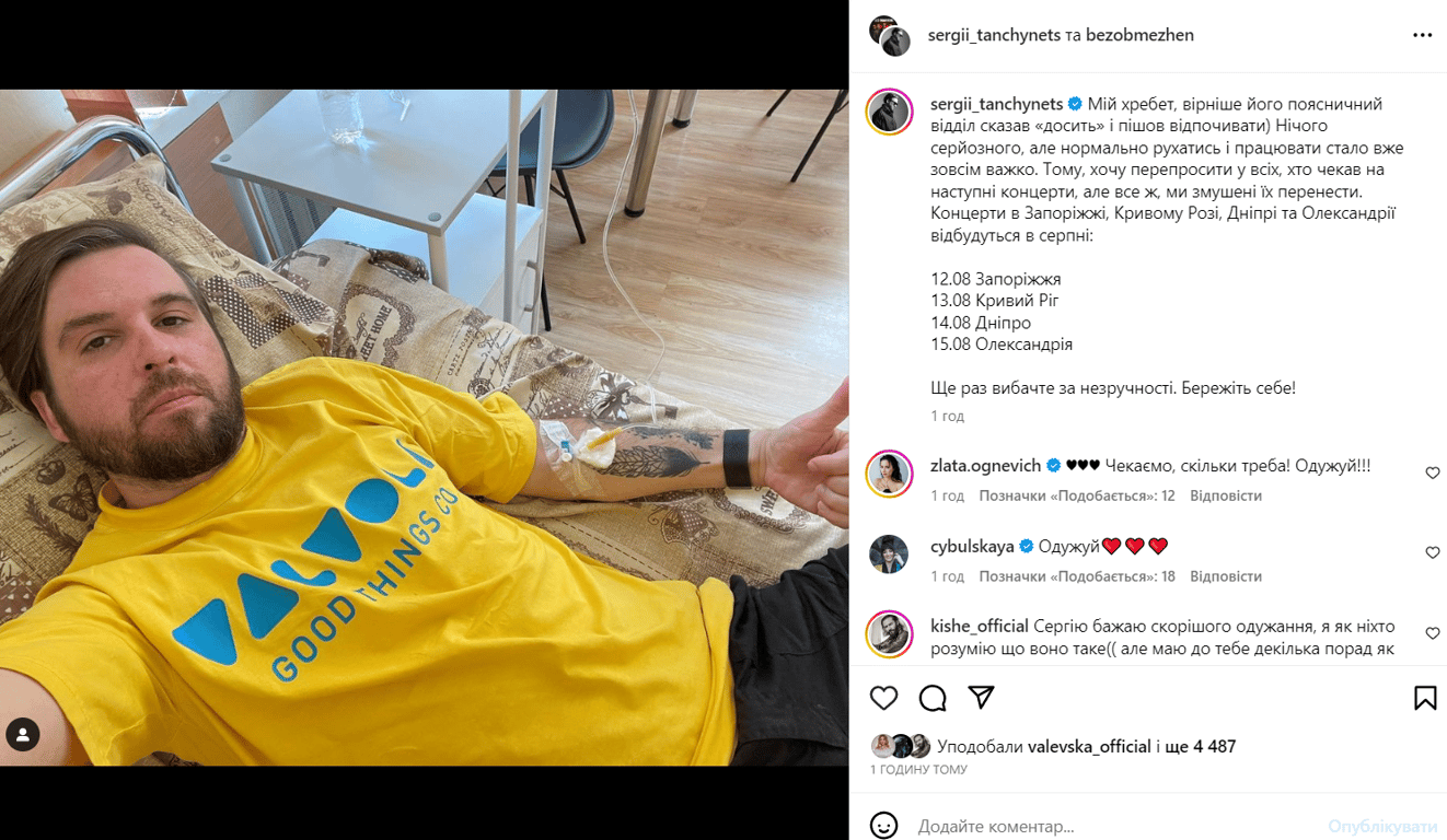 41-річний Танчинець опублікував фотографію з лікарні. В нього проблеми з попереком. Заплановані концерти в Запоріжжі, Кривому Розі, Дніпрі та Олександрії менеджмент гурту переніс на серпень.