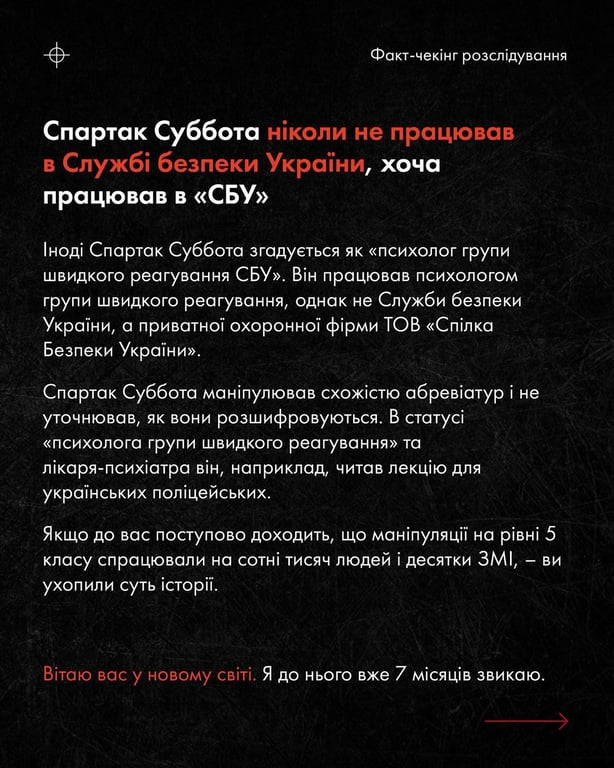 "Сім місяців дуже детальної роботи, щоб викрити найогиднішу людину, що мені доводилося бачити. Весь час працюючи над цим, мені постійно хотілося вимовити: "мені шкода, мені шкода". В мене немає ілюзій на рахунок того, що чекає аудиторію Спартака Субботи. Я психотерапевт і прекрасно знаю, як це називається — інформаційна травма. Це буде дуже потужна втрата довіри до світу, і тим не менш ця біль неминуча, бо насилля треба називати насиллям. Хтось взагалі буде відмовлятися вірити у все це і буде заперечувати. Захисні механізми будуть берегти психіку цих людей від травми, і це зрозуміло. Мене скоріш за все чекає дуже багато ненависті, хейту, жорстокості. З цим всім ок, поки що мене це не лякає", — написав ініціатор розслідування.