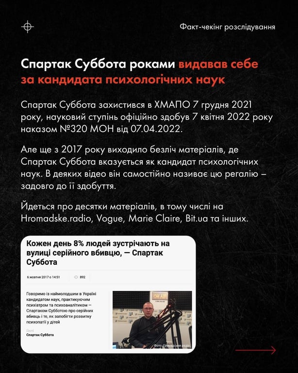 Спартак Суббота — чи не найбільш відомий психолог нашої країни. Український сегмент TikTok наповнений короткими відео з ними. Особливо його послуги та експертиза почали мати попит після початку повномасштабної війни. Проте разом зі швидким зростанням його кар'єри, так само швидко зростала кількість критики, особливо від інших психологів. Можна було б припустити, що колеги заздрять його успіхам. У своєму розслідуванні Ілля Полудьонний пояснює, чому питання зовсім в іншому.