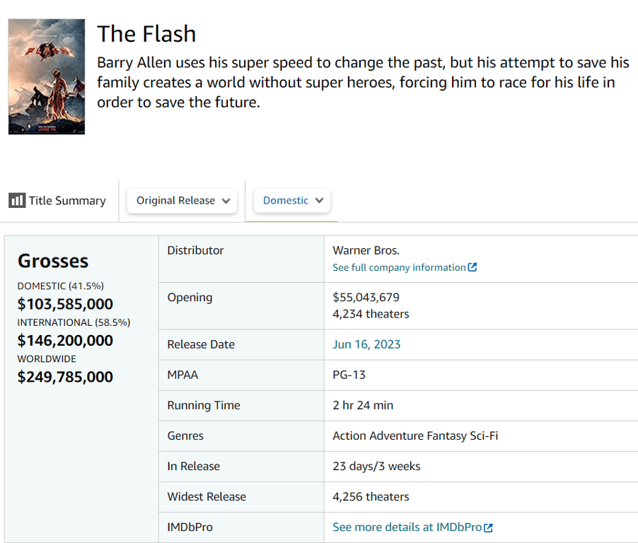 Бюджет фільму "Флеш" становив 220 мільйонів доларів. Додатково пішло 150 млн на маркетинг. А за 23 дні прокату стрічка зібрала менше 250 млн доларів. Такі показники призведуть до збитків кіностудії як мінімум у 200 млн доларів. Слід зазначити, що значну частину з бокс-офісу забирають дистриб'юторські компанії та кінотеатри. Тож продюсери не отримують заявлені вище кошти повністю.