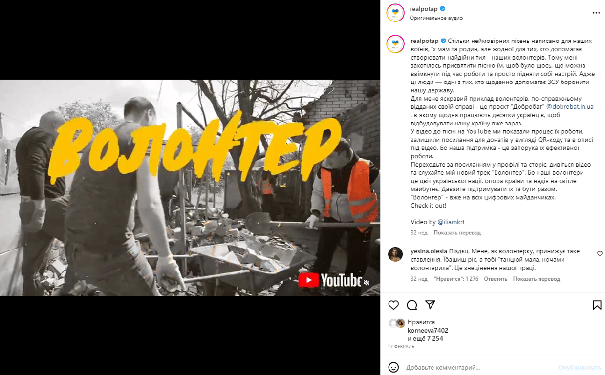 "Стільки неймовірних пісень написано для наших воїнів, їх мам та родин, але жодної для тих, хто допомагає створювати найдійни тил, — наших волонтерів. Тому мені захотілось присвятити пісню їм, щоб було щось, що можна ввімкнути під час роботи та просто підняти собі настрій", — розповів Потап.