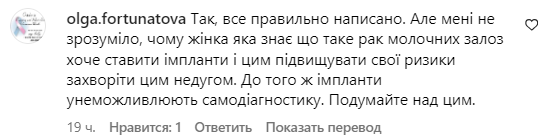 - Так, все правильно написано. Але мені незрозуміло, чому жінка, яка знає, що таке рак молочних залоз, хоче ставити імпланти і цим підвищувати свої ризики захворіти цим недугом. До того ж, імпланти унеможливлюють самодіагностику. Подумайте над цим