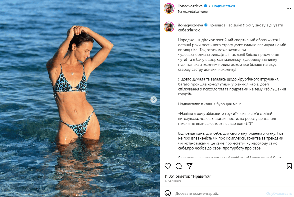 "Я хочу знову відчувати себе жінкою! Народження діточок, постійний спортивний спосіб життя і останні роки постійного стресу дуже сильно вплинули на мій вигляд тіла! Так, хтось може сказати "ви чудова, спортивна, рельєфна" і так далі! Звісно, приємно це чути! Та я бачу в дзеркалі маленьку, худорляву дівчинку-підлітка, яка з кожним новим роком все більше нагадує старшу сестру доньки, ніж жінку!" — зізналася Ілона Гвоздьова.