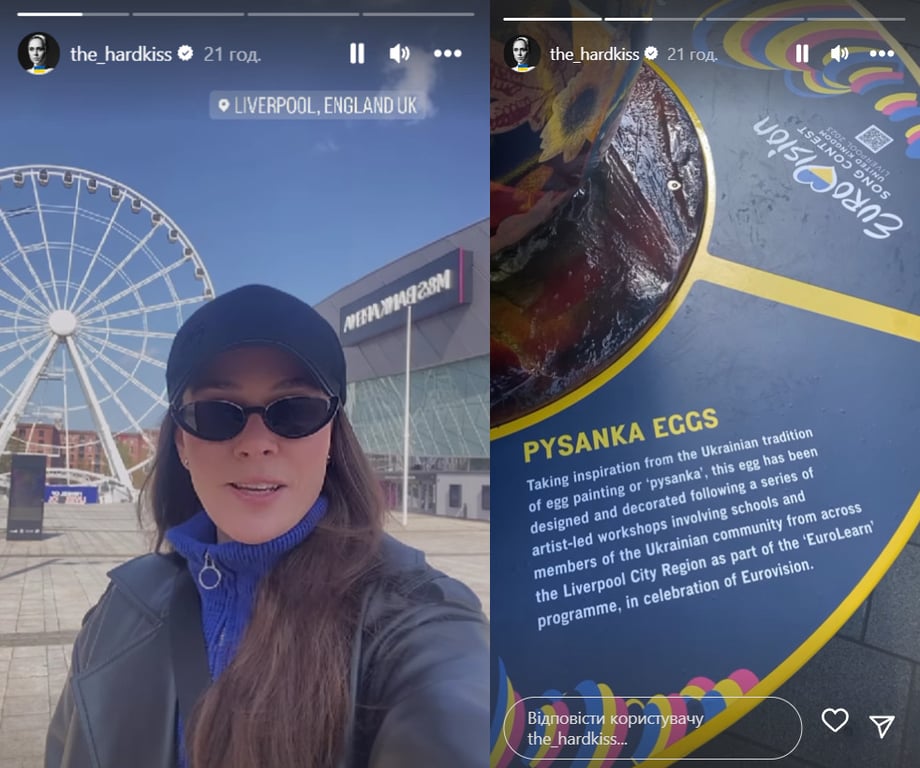 Тим часом фронтвумен гурту THE HARDKISS показала іншу культурну інсталяцію. Гігантські писанки розроблені дітьми з усього регіону міста Ліверпуль та українською громадою. Дизайни відображають українську культуру та традиції, культуру та традиції інших країн учасниць "Євробачення" та ширших громад регіону міста Ліверпуль.