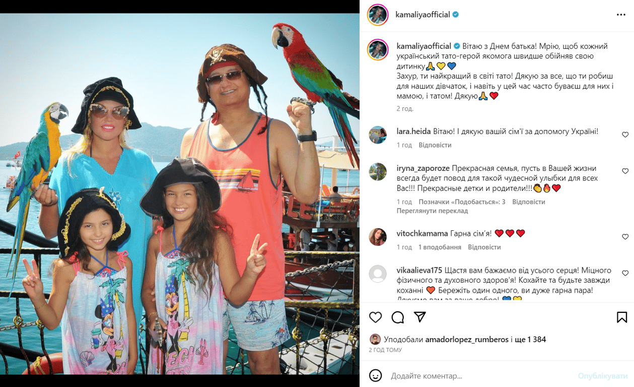 В День батька Камалія опублікувала архівне сімейне фото з відпочинку в Туреччині. Родина позує в піратських капелюхах. А співачка з бізнесменом тримають в руках екзотичних папуг.