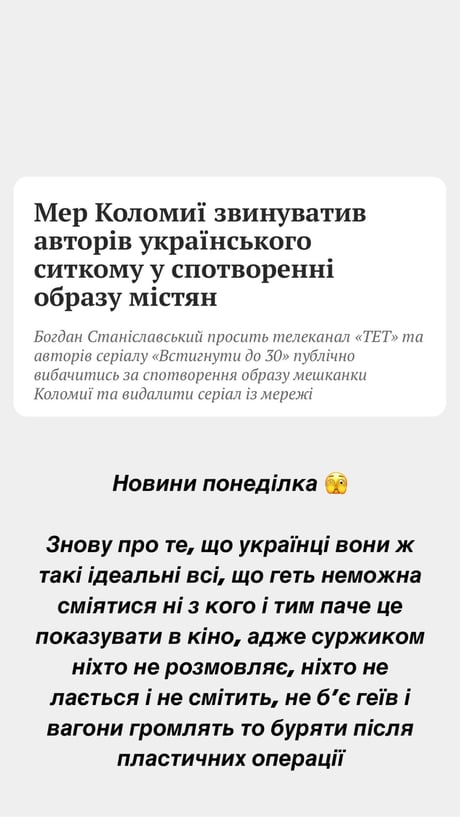 Нещодавно у мережі розгорівся скандал із серіалом "Встигнути до 30". Мешканці Коломиї образились, що одна з героїнь серіалу — їхня землячка, але розмовляє не притаманним Прикарпаттю суржиком і не демонструє інтелектуальних здібностей.