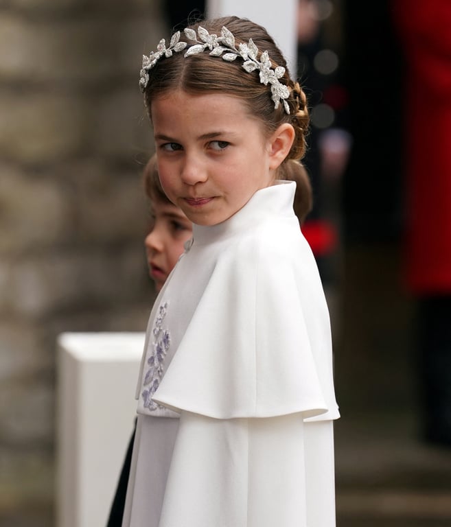 Принцеса Уельська прибула на церемонію разом з родиною, принцом Вільямом та двома старшими дітьми. Для свого виходу Кейт Міддлтон обрала елегантну сукню кольору слонової кістки від британського дому високої моди Alexander McQueen, прикрашену вишивкою з квітковими мотивами.