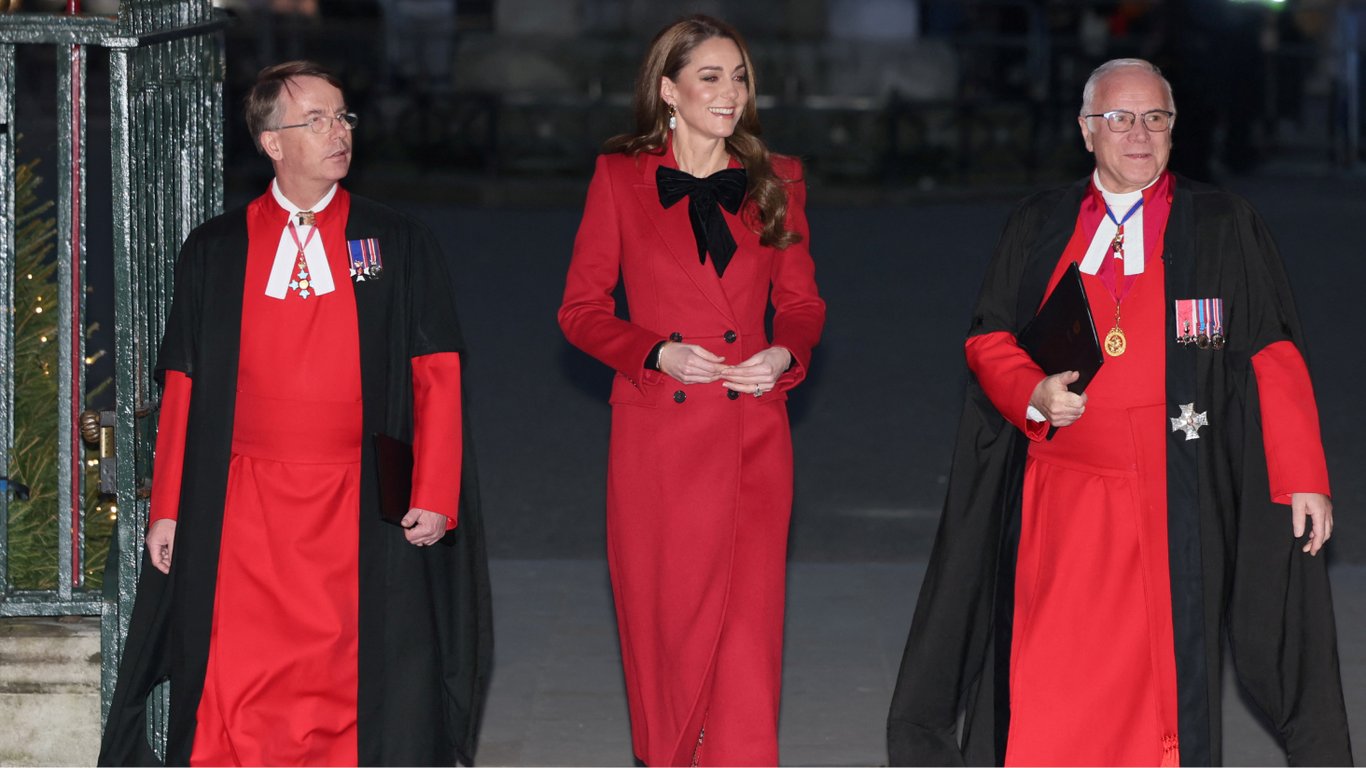 Для публічної появи 42-річна Кейт обрала святкове червоне пальто з чорним оверсайз бантом від Сари Бертон для Alexander McQueen. Біля Вестмінстерського абатства (Лондон, Велика Британія) принцесу Уельську зустрів преподобний доктор Девід Гойл, декан Вестмінстера.
