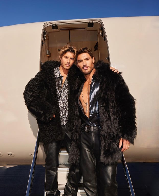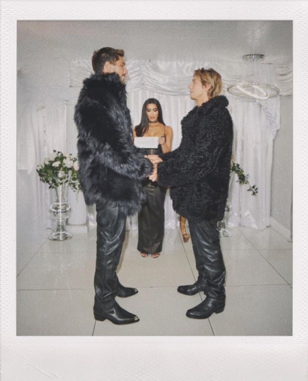 На фотографіях зображені Гейдж і Епплтон у чорних шкіряних штанях і чорних пухнастих куртках з Кардашьян на тлі знакових білих кованих залізних воріт маленької білої каплиці в Лас-Вегасі.