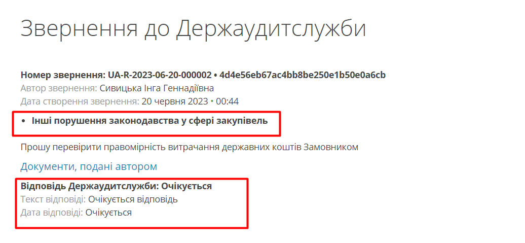 В червні громадянка Інга Сивицька подала скаргу на тендер. Вона попросила перевірити правомірність витрачання державних коштів замовником. Відповіді вона так і не отримала. Водночас державне підприємство оголосило другий тендер і уклало договір.