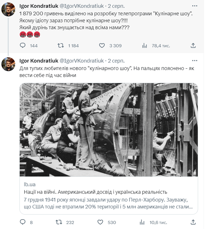 Його публікацію подивилось майже 80 тисяч користувачів соцмережі. Понад три тисячі з них поставили лайк. Також Кондратюк порадив почитати матеріал, як під час Другої Світової війни в США запровадили тотальну економію.
