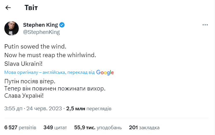 75-річний "король жахів" лаконічно, але водночас і влучно метаморфне прокоментував повстання ПВК "Вагнер", діяльність якої особисто затвердив диктатор Путін.