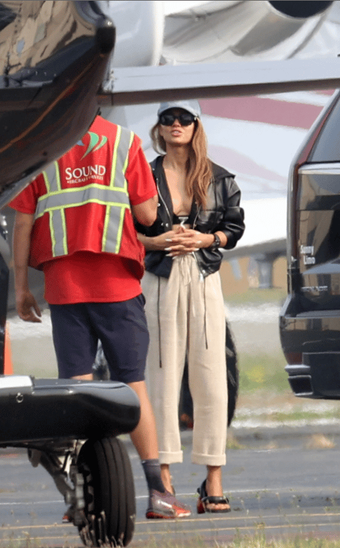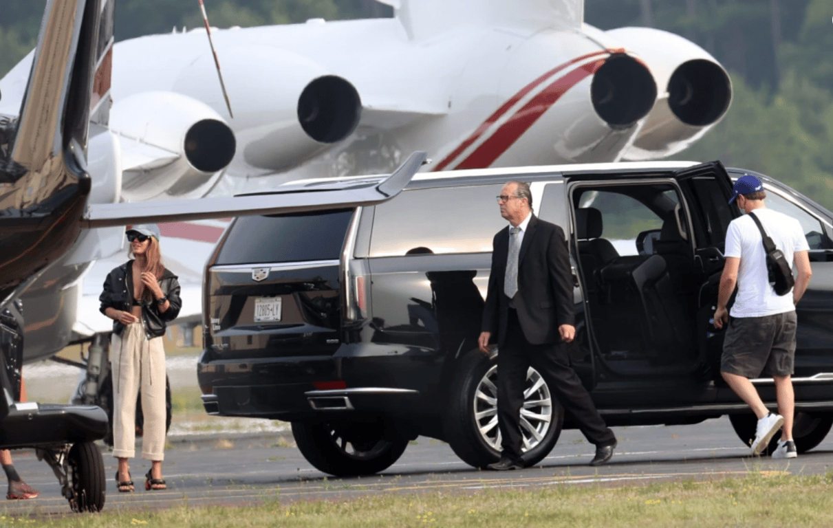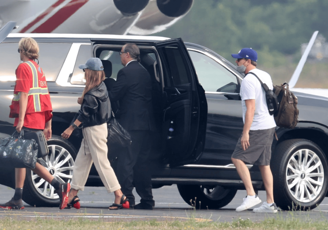 Після приземлення на околиці Нью-Йорку охорона допомогла двом зірковим пасажирам завантажити свій багаж у чорний позашляховик, перш ніж вони поїхали в напрямку Гемптону.