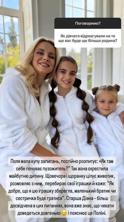 "Так вона охрестила майбутню дитину. щовечора і щоранку цілує животик, розмовляє з ним, перебирає свої іграшки й каже: "Як добре, що я цю іграшку берегла, маленький братик чи сестричка буде гратися". Старша, Діана, — більш досвідчена в цих питаннях, вона вже знає, що чекати доведеться довгенько, і пояснює це Полі", — поділилася Лілія Ребрик.