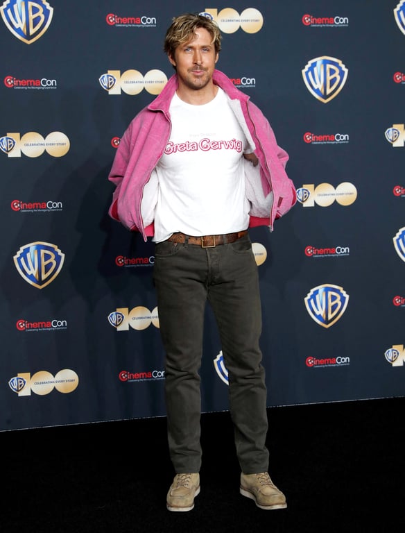 42-річний Раян продемонстрував папараці та гостям заходу футболку з ім'ям режисера фільму Грети Гервіг, написаним фірмовим барбі-шрифтом.