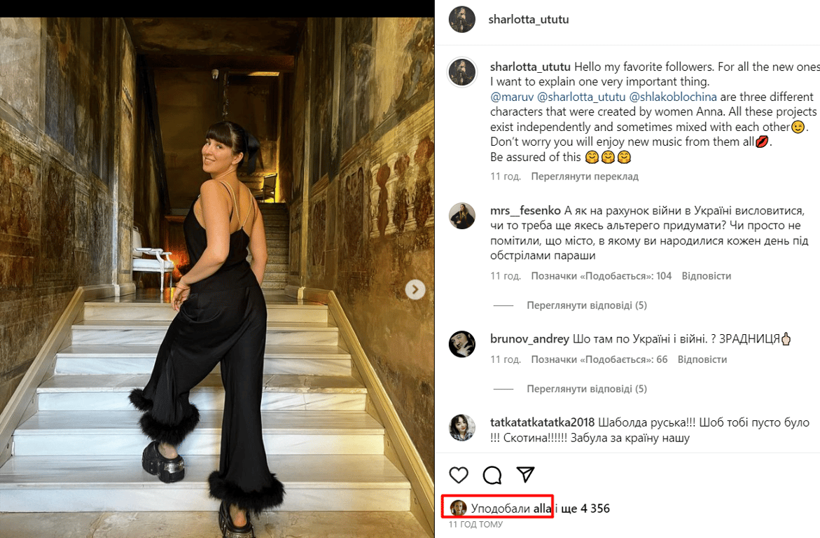 Водночас лайк під публікацією поставила супермодель Алла Костромічова, яка нещодавно народила другу дитину. Вона також живе за кордоном. Причини її підтримки MARUV невідомі. В коментарях Алла не стала нічого писати.