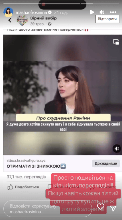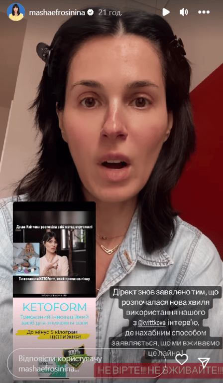 Шоувумен Маша Єфросиніна обурена активізацією шахраїв, які продають псевдомедичні препарати для схуднення від її імені. Також злочинці долучили й інших знаменитостей, в яких Маша брала інтерв’ю.