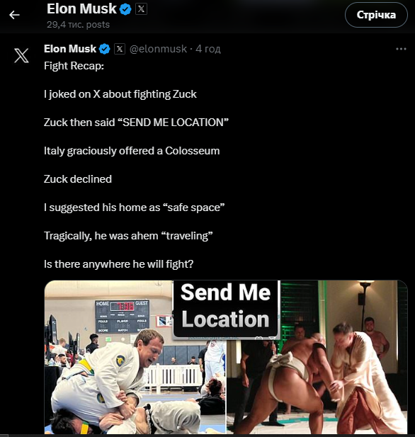 Нагадаємо, раніше ми писали, що італійська влада запропонувала Колізей для бою між Маском та Цукербергом. Також ми розповідали, що Ілон Маск анонсував прямий ефір поєдинку у своїй соцмережі.