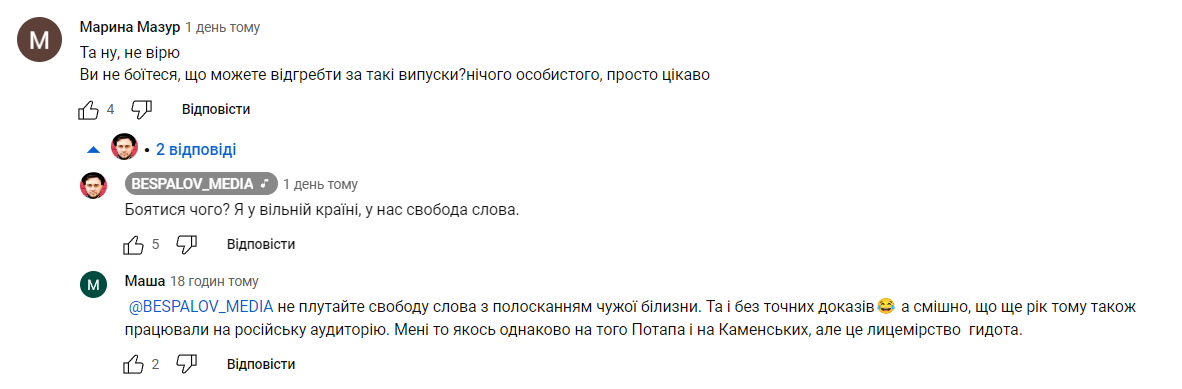 Одна з підписниць блогера поцікавилась, чи не боїться він того, що йому доведеться відповідати за свої слова. На цей коментар Беспалов таки відповів.