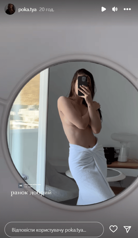 Буквально за декілька годин до того, як Катерина знепритомніла, вона опублікувала відверте фото у дзеркалі. Полтавська позувала без верхнього одягу та бюстгальтеру. Своє поточне самопочуття молода дружина Остапчука поки що не коментує.