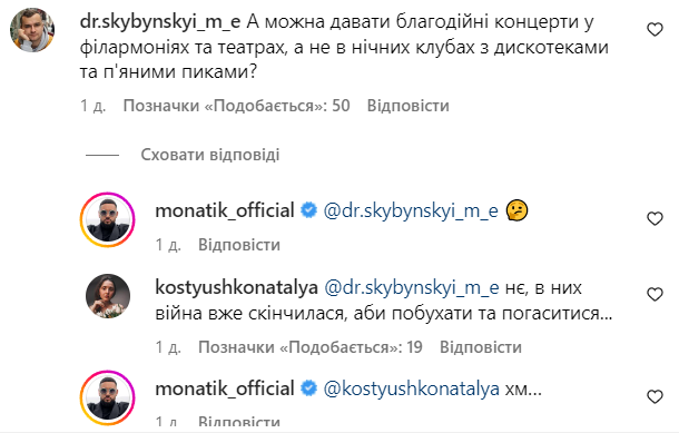 Інші підписники не зацінили локацію благодійного концерту та публіку. На ці звинувачення Дмитро відповів смайлами.