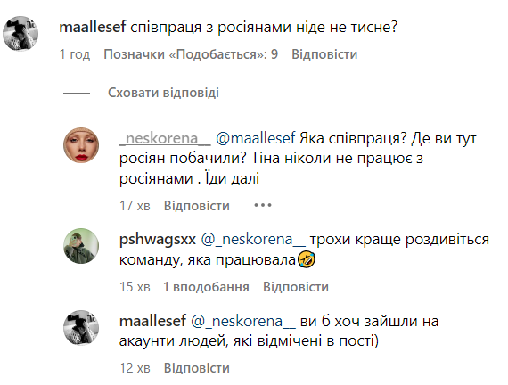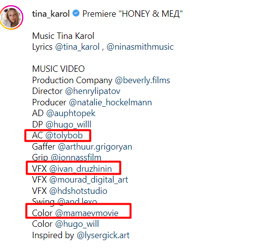 У своєму дописі Кароль відмітила всіх, хто працював над кліпом. І серед них шанувальники співачки помітили трьох жителів РФ, які за свою роботу скоріш за все отримали гроші від Тіни. Якщо авжеж, не працювали благодійно. Двоє з них з міста Тюмень.