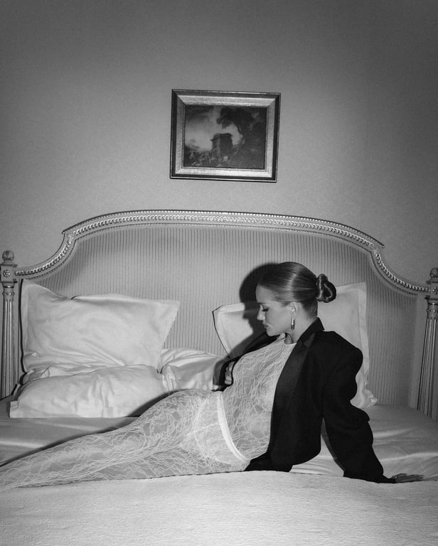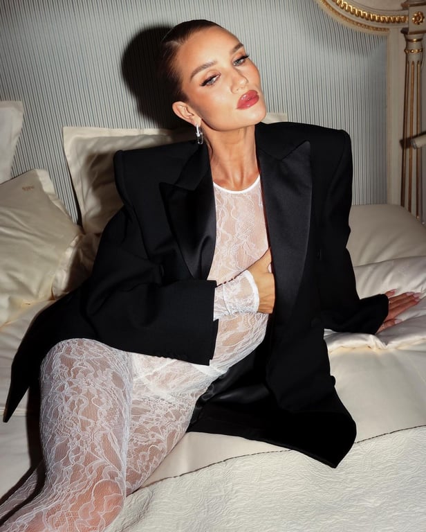 На фото Роузі Гантінгтон-Вайтлі позує на ліжку в білому вбранні, під яким не має білизни. На плечі модель накинула піджак.