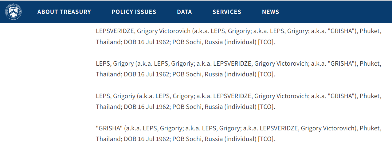 Також у матеріалах Мінфіну США він фігурував як "Григорій Вікторович Лепсверідзе, який народився 16 липня 1962 року в Сочі, відомий також як "Григорій Лепс" та "Гриша" і проживає на острові Пхукет (Таїланд)". Відомство стверджувало, що пропагандист нібито "перевозив гроші" для одного з передбачуваних ватажків Brothers Circle Владислава Леонтьєва.