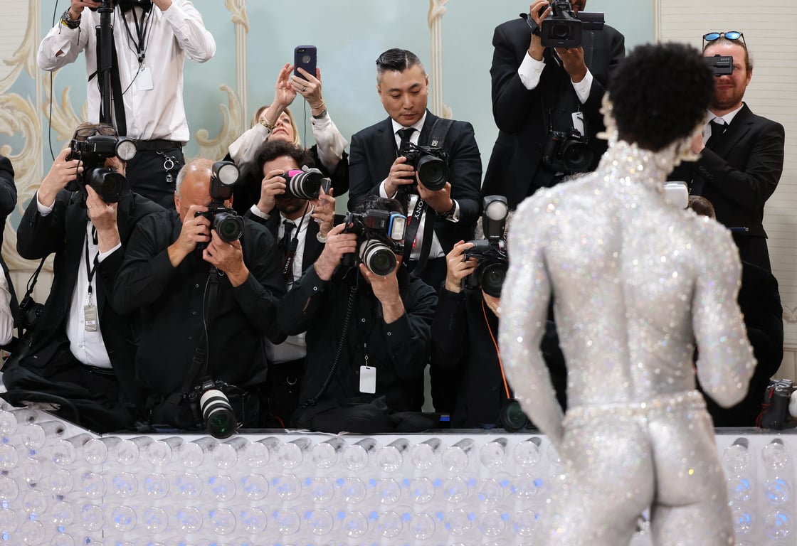 24-річний репер одягнув лише стрінги та черевики на платформі. Lil Nas X був покритий срібною фарбою та блискучими стразами, а також вишуканими перлинними деталями на шиї та обличчі, щоб перетворитися на гламурного кота. То ж до киці Карла Лагерфельда цього року була прикута особлива увага. Як і до оголеної п’ятої точки репера.