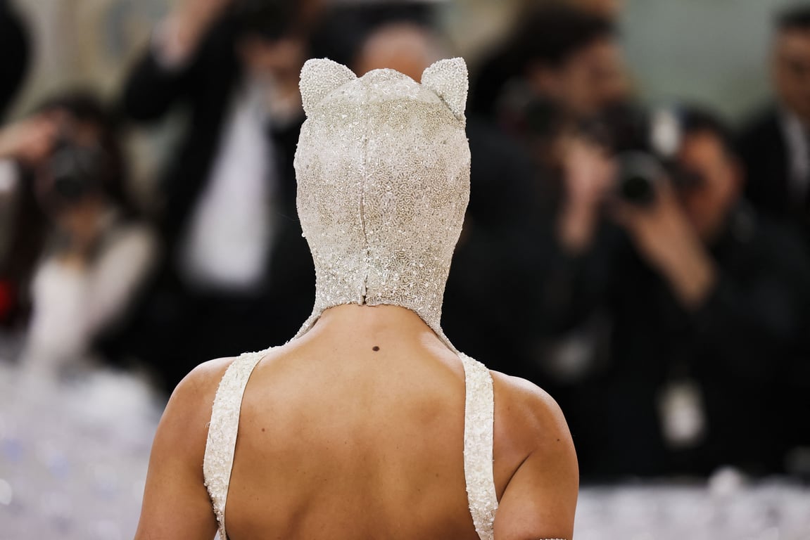 Американська реперка також віддала пошану улюбленій 11-річній киці Лагерфельда, яка до речі ще жива, але на Met Gala не приїхала. Сукня Doja Cat з капюшоном від Oscar de la Renta включала котячі вушка на капюшоні, а також сріблясті блискітки, відкриту спину та силует русалки, який подовжувався в білий пір’яний шлейф.
