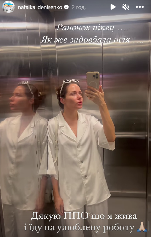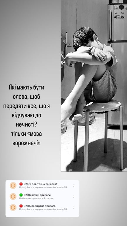 Шоувумен, яка сьогодні відзначає 20-річчя шлюбу з чоловіком, бізнесменом та захисником України Тимуром Хромаєвим, зробила скриншоти сповіщення про повітряні тривоги та додала фотографію сина, який сидить на табуретці.