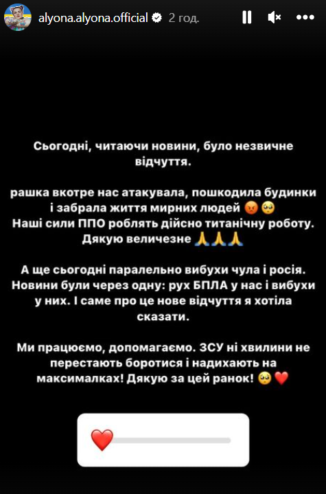 Нагадаємо, раніше ми писали про реакцію знаменитостей на атаку "шахедів" на столицю в День Києва, 28 травня. Також ми розповідали, як українські зірки відреагували на загибель ватажка ПВК "Вагнер" Євгена Пригожина.